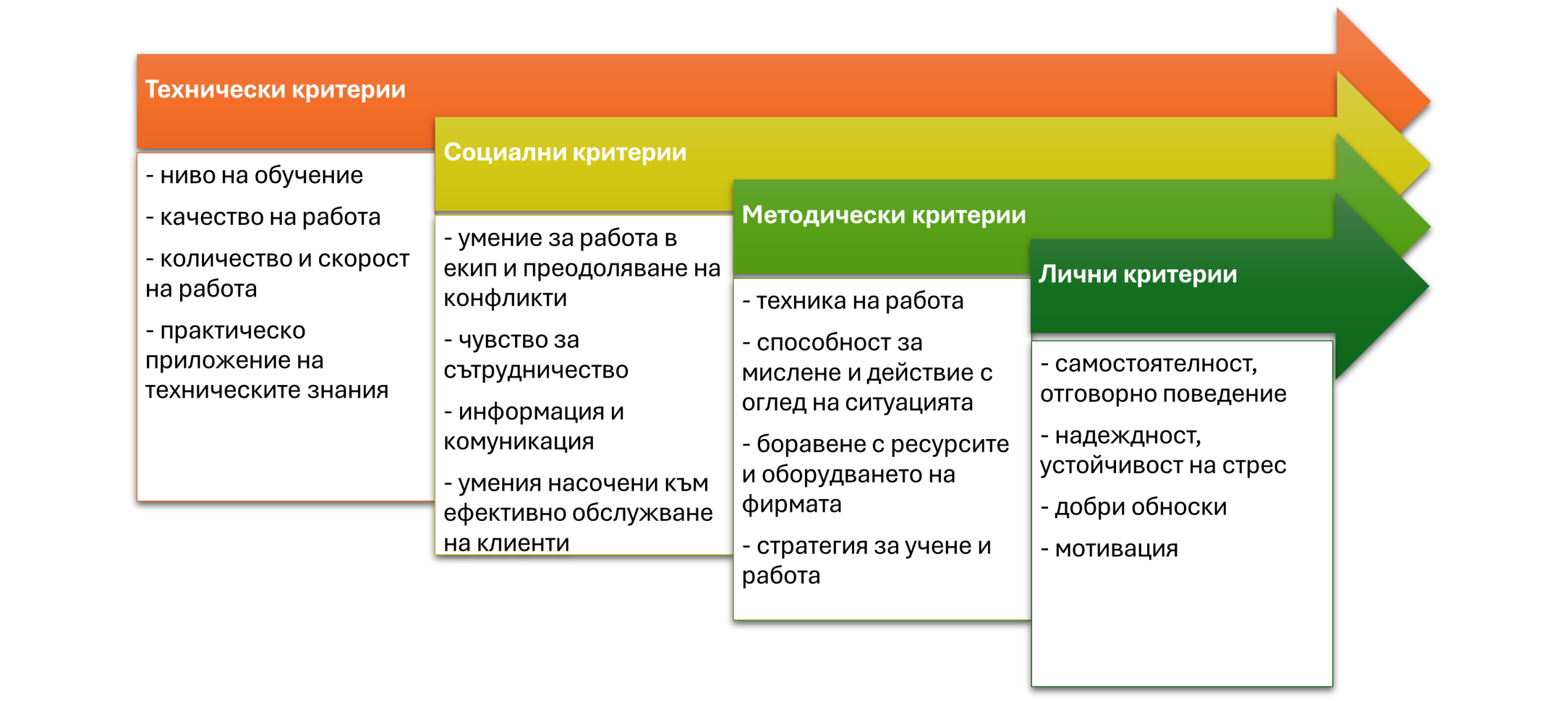 За да оцените напредъка на стажант с по-малко възможности или от среда в неравностойно положение, можете да приложите следните критерии за оценка: