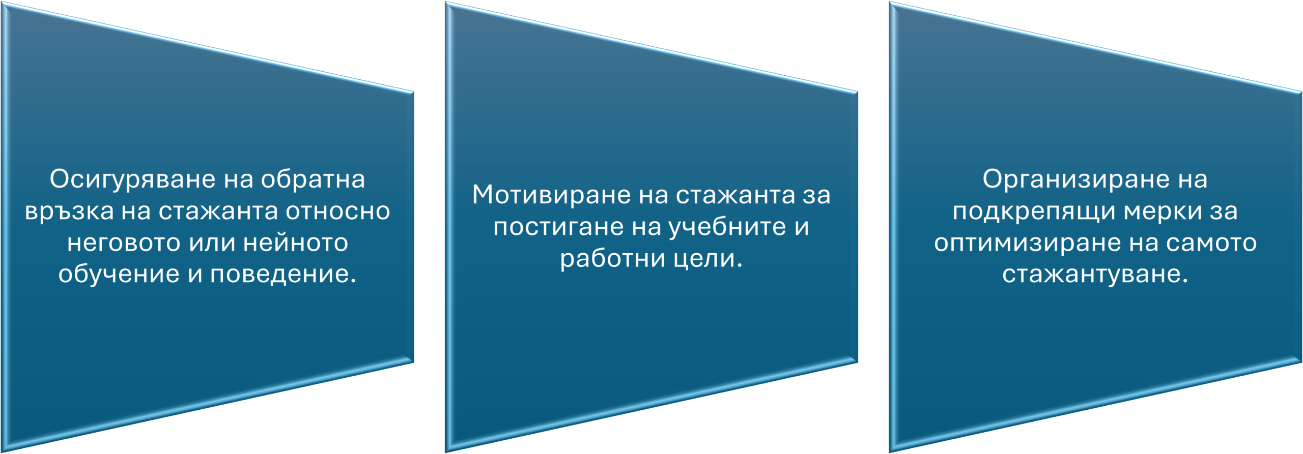 Процесът на оценяване дава възможност на стажанта да изрази мнение относно резултатите от оценяването или да постави въпроси. Много важен за успеха на оценяването е истинският диалог. Стажантът не трябва да бъде пасивен слушател, а трябва да бъде поканен като партньор в процеса.