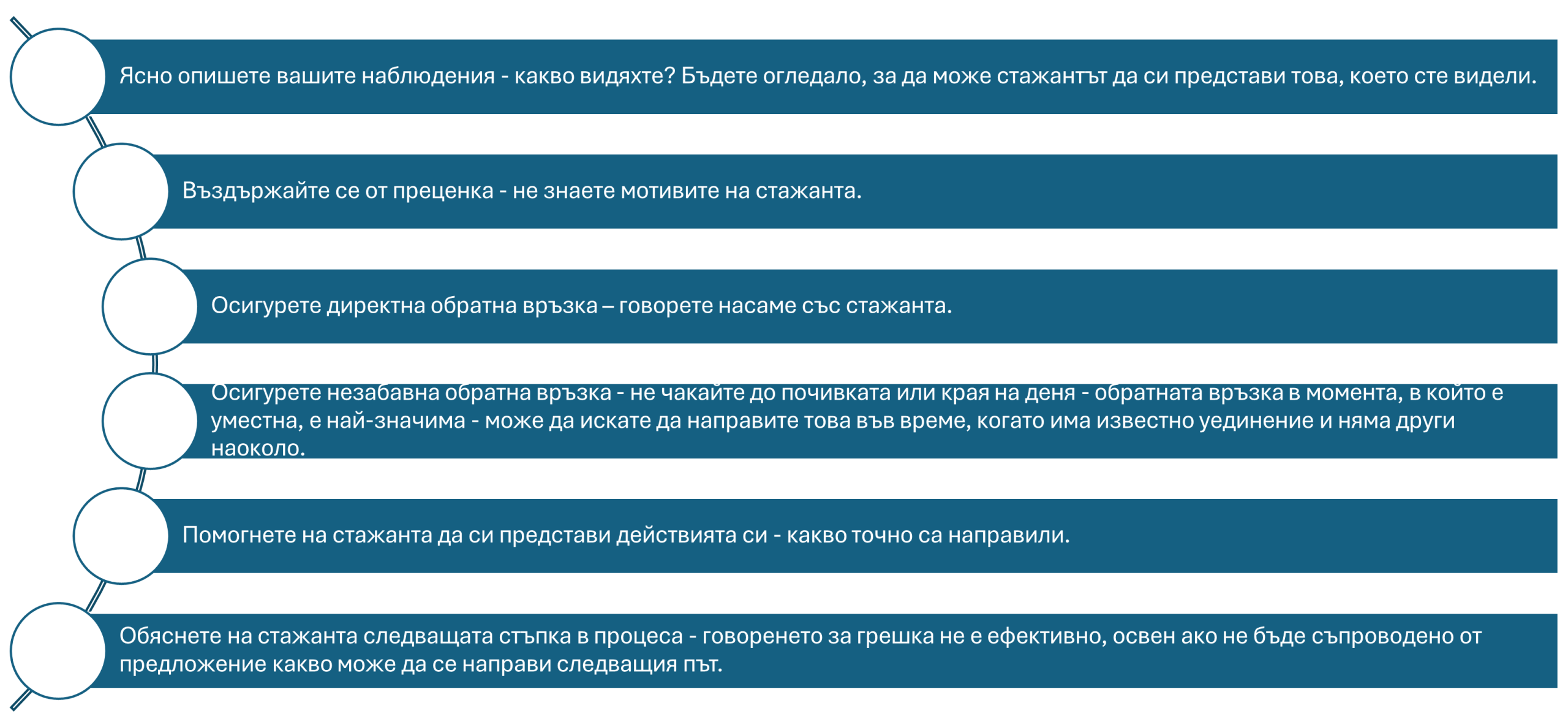 Техниките за осигуряване на ефективна обратна връзка включват: