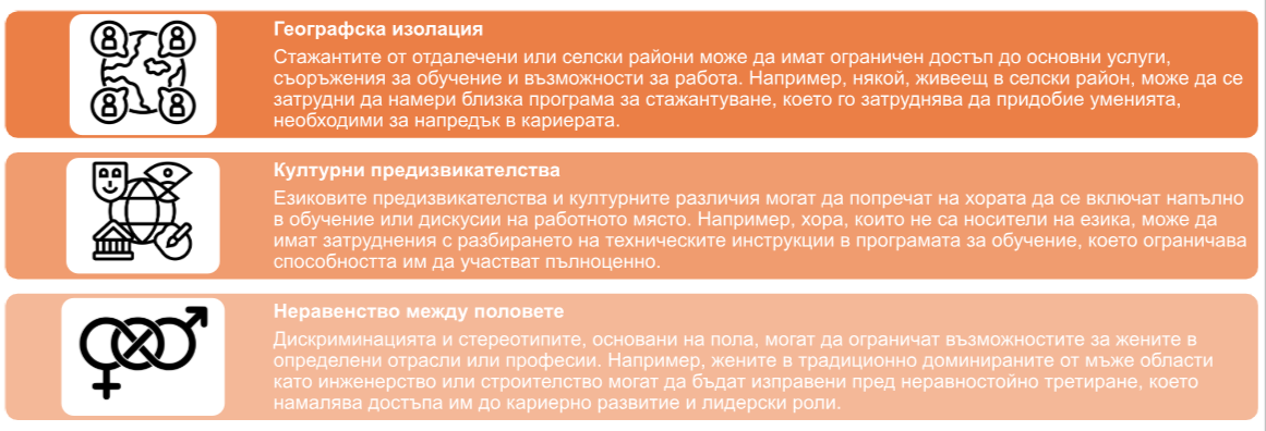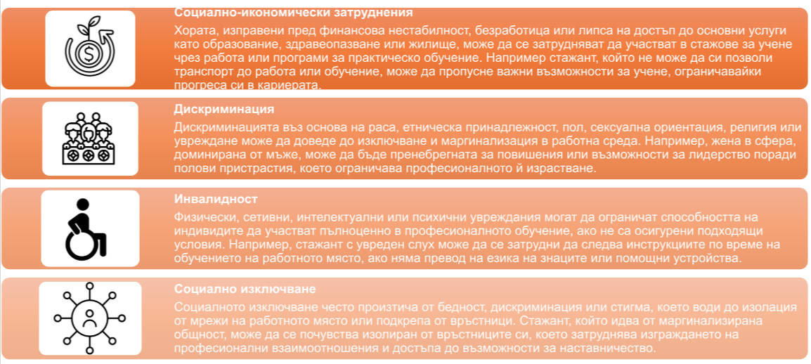 В контекста на работата е важно да се разпознават различните форми на неравностойно положение, които могат да попречат на хората да се включат пълноценно в професионално обучение или обучение на работното място. Тези обстоятелства често са резултат от системни предизвикателства, водещи до изключване от възможности.