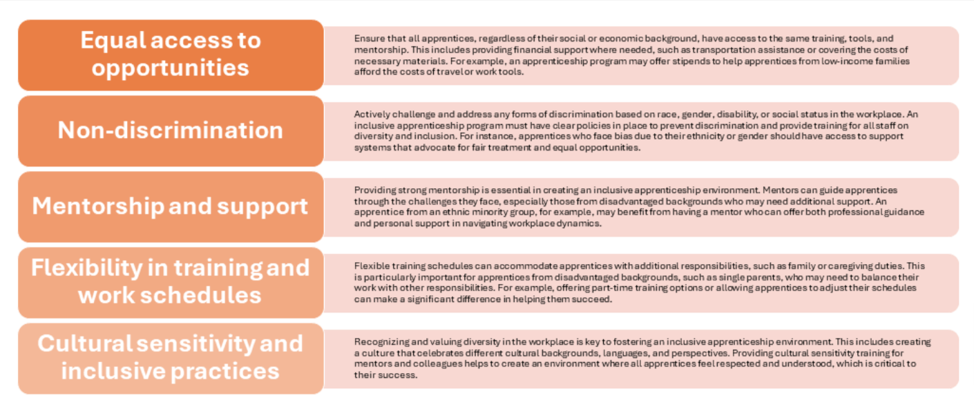 In the context of apprenticeships, promoting social inclusion means ensuring that all apprentices, regardless of their background or circumstances, have equal access to opportunities and resources. It involves creating an environment where everyone feels valued and supported in their learning and professional development.
