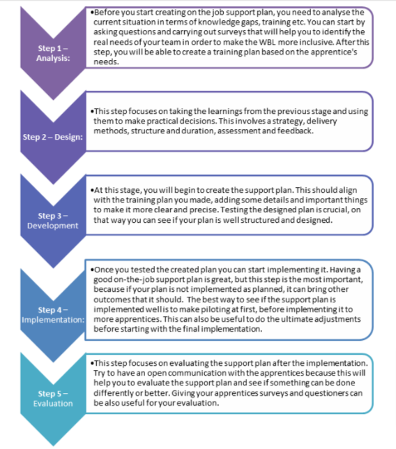 Creating a specific on-the-job support plan can be done easier using the ADDIE model. ADDIE stands for