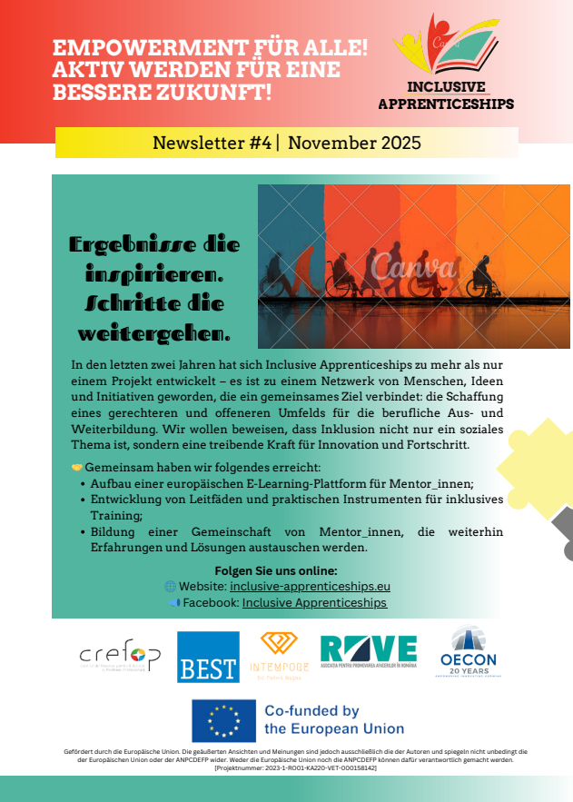– 3 Fallstudien, die die Wirksamkeit des INCLUSIVE APPRENTICESHIPS-Ansatzes zur Förderung der sozialen Eingliederung und zur Steigerung der Attraktivität der beruflichen Bildung belegen.