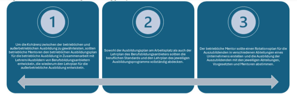Entsprechend dem betrieblichen Ausbildungsplan sollten Berufsbildungsanbieter auch einen Plan für die betriebliche Weiterbildung erstellen, der die betriebliche Ausbildung am Arbeitsplatz ergänzt. Die Kombination aus außerbetrieblicher und betrieblicher Weiterbildung garantiert, dass die Auszubildenden nach Abschluss des Programms berufsbereit sind.