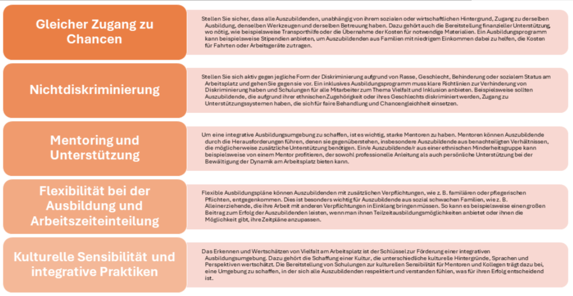 Im Zusammenhang mit der Berufsausbildung bedeutet die Förderung sozialer Inklusion, sicherzustellen, dass alle Auszubildenden, unabhängig von ihrer Herkunft oder ihren Umständen, den gleichen Zugang zu Chancen und Ressourcen haben. Dazu gehört die Schaffung einer Umgebung, in der sich jeder in seinem Lernen und seiner beruflichen Entwicklung wertgeschätzt und unterstützt fühlt.