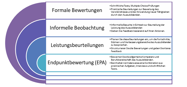 Die Zuweisung von Verantwortung durch die Benennung eines Koordinators oder einer Managerin zur Überwachung der Umsetzung kann sehr hilfreich sein. Diese Person sollte den Fortschritt überwachen, auftretende Probleme ansprechen und sicherstellen, dass alle Aspekte des Plans wie geplant umgesetzt werden. Mentor_innen sollten außerdem dafür verantwortlich sein, ihre Auszubildenden regelmäßig zu unterstützen und anzuleiten. Dazu gehören strukturierte Check-ins, um den Fortschritt zu überprüfen und etwaige Herausforderungen zu bewältigen.