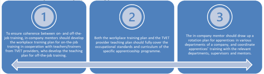 Corresponding to the organisation training plan, TVET providers should also prepare a plan for off-the-job training that complements on-the-job training at the workplace. The combination of on- and off-the-job training guarantees that apprentices are work-ready on completion of the programme.