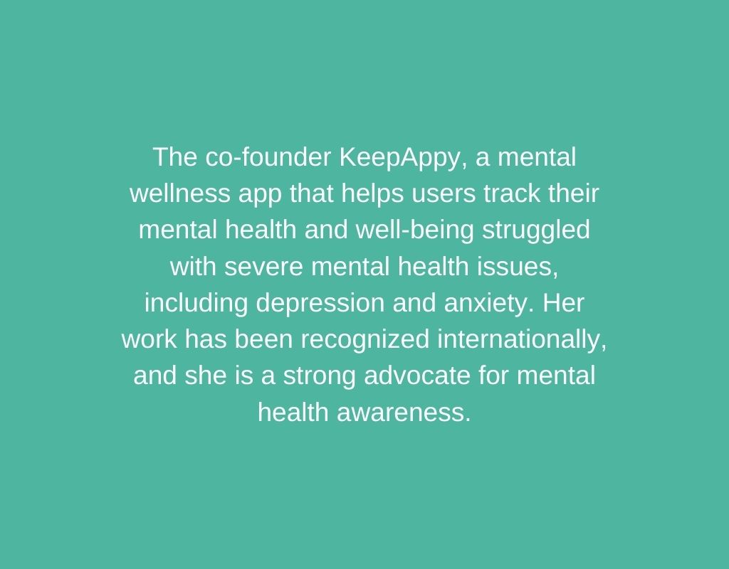 The co-founder KeepAppy, a mental wellness app that helps users track their mental health and well-being struggled with severe mental health issues, including depression and anxiety. Her work has been recognized internationally, and she is a strong advocate for mental health awareness.