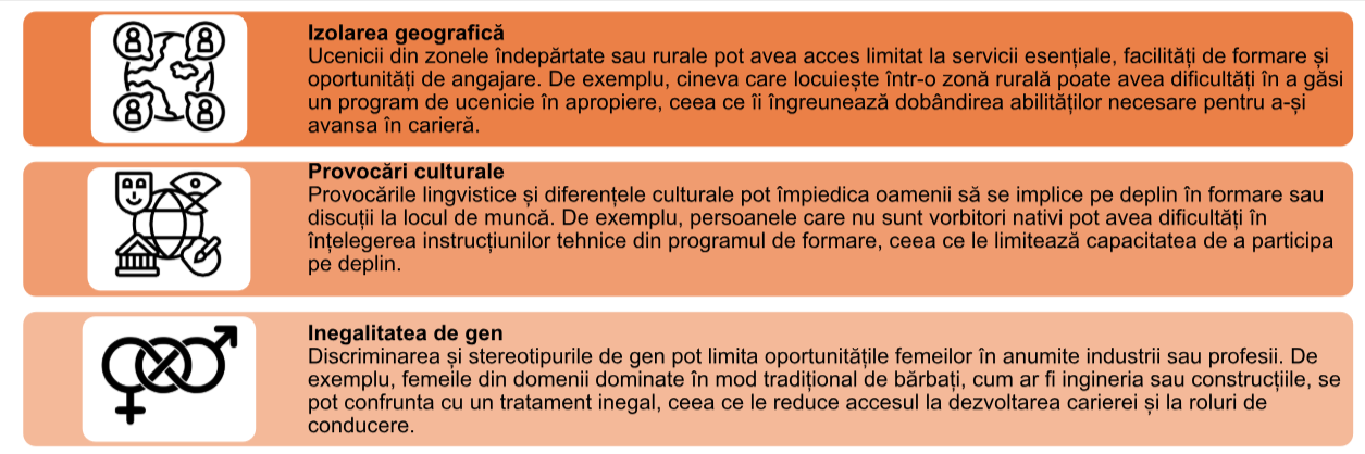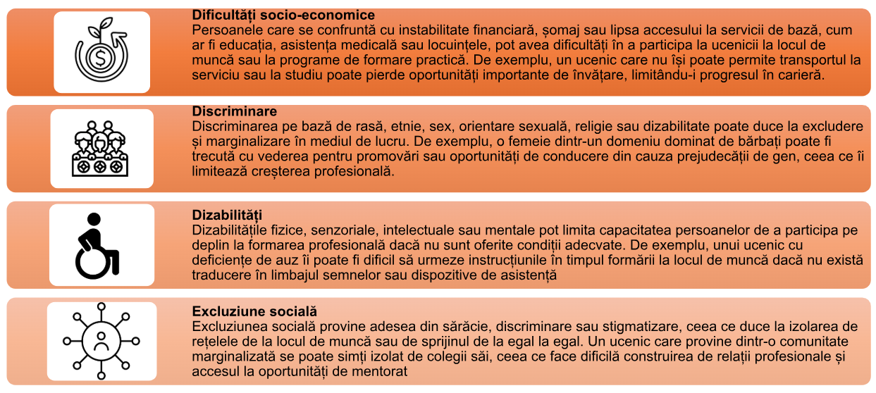În contextul ocupării forței de muncă, este important să se înțeleagă diversele forme de dezavantaje care pot împiedica oamenii să se implice pe deplin în formarea profesională sau în dezvoltarea profesională continuă. Aceste dezavantaje sunt adesea rezultatul unor bariere sistemice și duc la refuzul oportunităților.