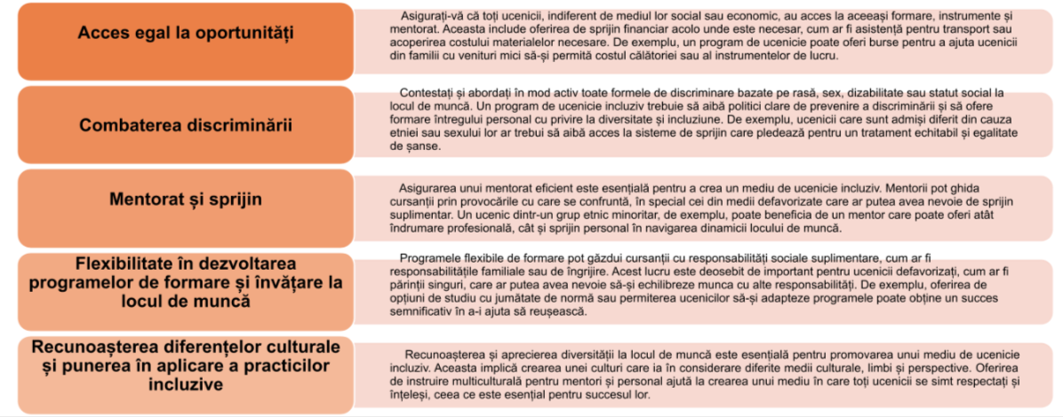 În contextul educației și formării profesionale, promovarea incluziunii sociale înseamnă asigurarea faptului că toți ucenicii, indiferent de mediul sau circumstanțele lor, au acces egal la oportunități și resurse. Aceasta include crearea unui mediu în care fiecare persoană se simte valorizată și sprijinită în procesul de învățare și dezvoltare profesională.