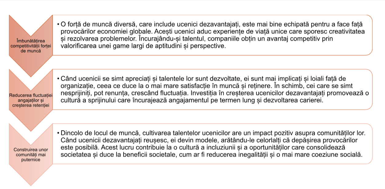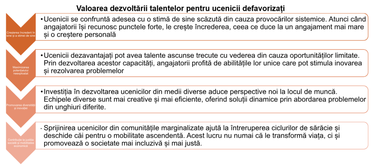 Această secțiune explorează motivele pentru care ucenicii defavorizați se confruntă adesea cu provocări în formarea profesională și importanța sprijinului. Lecția examinează exemple practice de programe de dezvoltare a talentelor de succes și se încheie cu reflecții asupra beneficiilor societale ale sprijinirii acestor persoane.