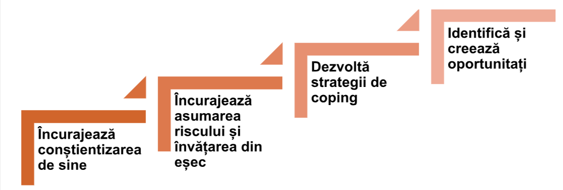 | Pași | Încurajează conștientizarea de sine | Încurajează asumarea riscurilor și învățarea din eșec | Dezvoltați strategii de coping | Identificați și creați oportunități |