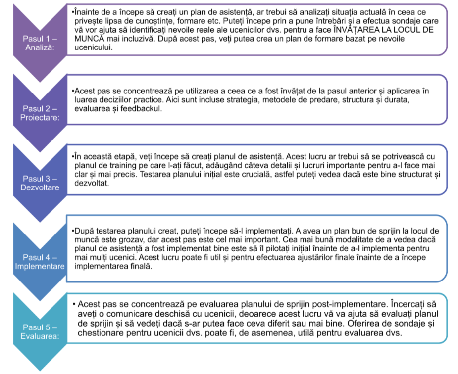 rearea unui plan specific de sprijin la locul de muncă poate fi facilitată cu modelul ADDIE. ADDIE este prescurtarea de la